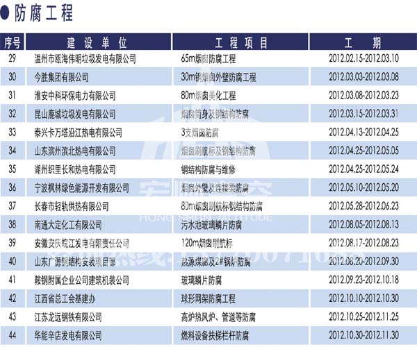 宏順建設(shè)工程有限公司是國家批準(zhǔn)成立的專業(yè)高空作業(yè)企業(yè):承攬過(國內(nèi).國外)煙囪新建、煙囪防腐、吊機(jī)防腐、水塔防腐、管道防腐、龍門吊防腐、儲存罐防腐、煙囪內(nèi)壁防腐等高空作業(yè)工程。具有“不搭腳手架 、 不需要停產(chǎn)”施工特點。